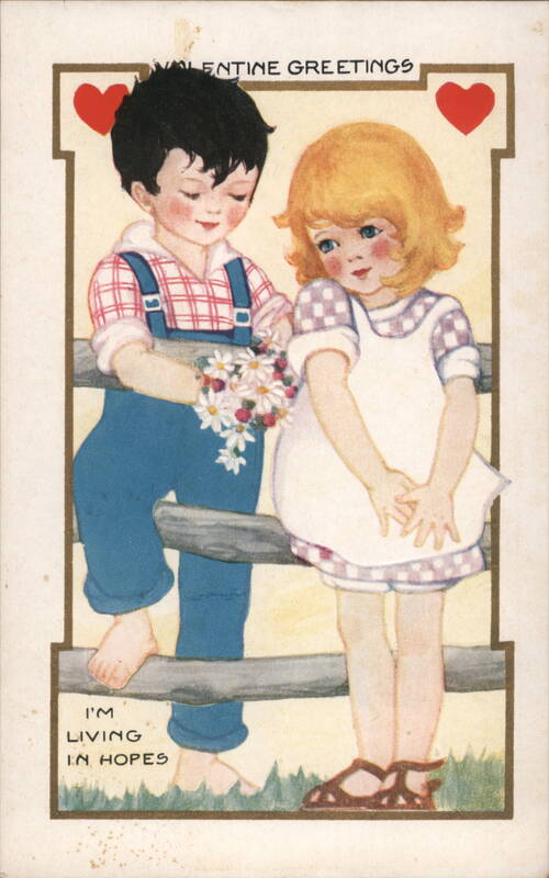 An illustration of a young boy in overalls and a plaid shirt, barefoot, presenting a bouquet of small white and pink flowers to a young girl in a white dress with a checkered trim. They are standing next to a wooden fence. The card includes the sentiment 'I'M LIVING IN HOPES'.
