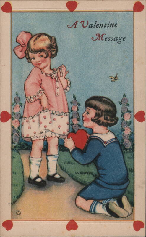 | A young boy kneels, offering a red heart to a young girl dressed in a pink frock with a large bow in her hair. The background features a path, green grass, and blooming rose bushes. A small bird flies in the upper right corner. The card's border is decorated with small red hearts. |