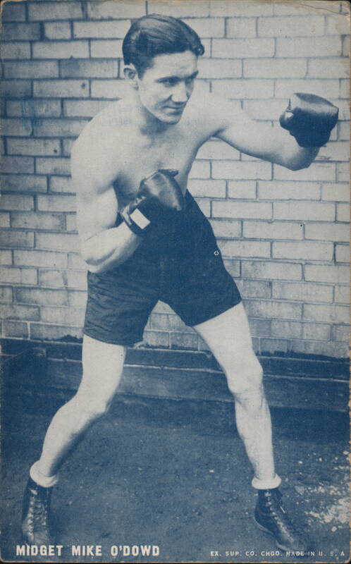 A shirtless boxer, Midget Mike O'Dowd, poses in a fighting stance with boxing gloves, set against a brick wall. The image has a distinctive blue tone.