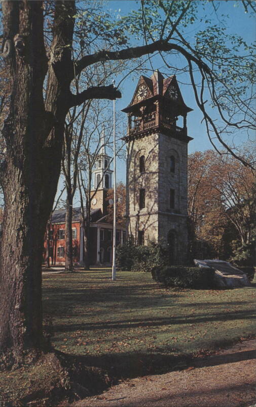 Stone tower erected in 1870 on the site of an an Indian Meeting House, with the Congregational Church (built 1824) in the background.