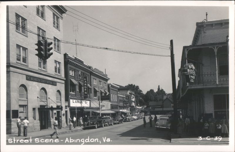 A bustling street with vintage cars, pedestrians, and businesses including Large's and the Belmont Hotel. A traffic light and utility poles are visible.