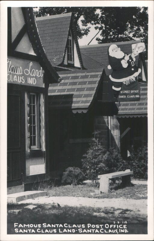 A black and white view of the Santa Claus Post Office building with a large Santa Claus figure on the roof. Signs for "Claus Land" and "U.S. Post Office" are visible.