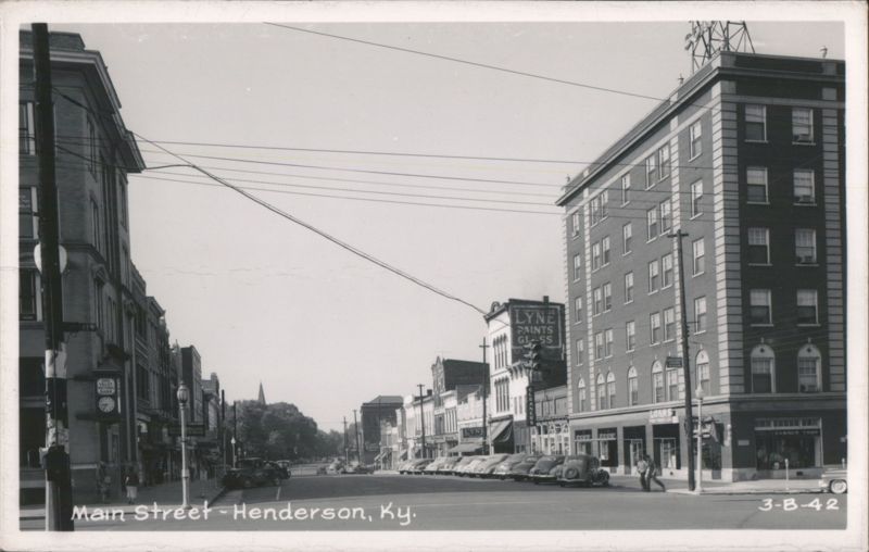 A bustling view of Main Street featuring the Ohio Valley National Bank building, Lyne Paints Glass, a Barber Shop, and Cleaners, with numerous cars parked along the street and people walking.