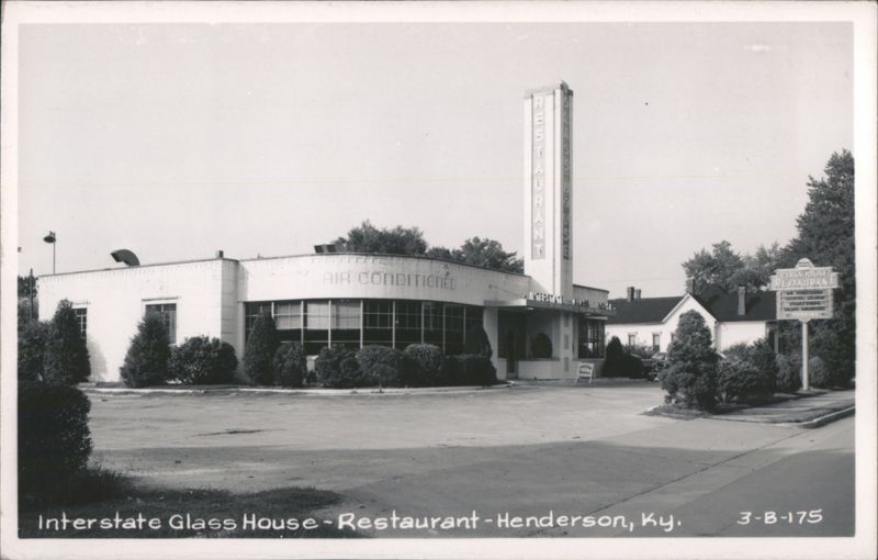 Exterior view of the Interstate Glass House Restaurant, featuring a tall sign and a roadside sign listing amenities such as air conditioning, cocktail lounge, steaks, chops, salads, sandwiches, and parking.