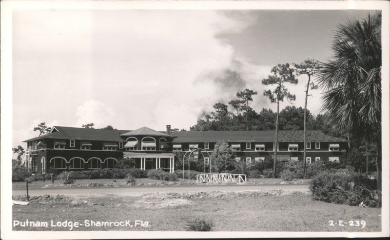 Exterior view of the lodge building with a road in the foreground and trees surrounding it. Smoke is visible in the background sky.