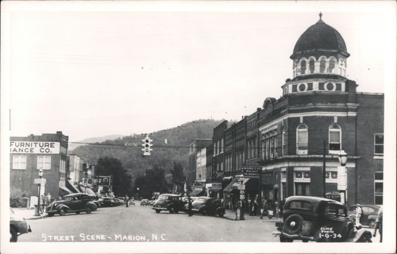 | A bustling street scene featuring numerous vintage automobiles, pedestrians, and various businesses, including a furniture store and a hardware store. A distinctive building with a domed top anchors the right side of the street, and a traffic light hangs overhead. |