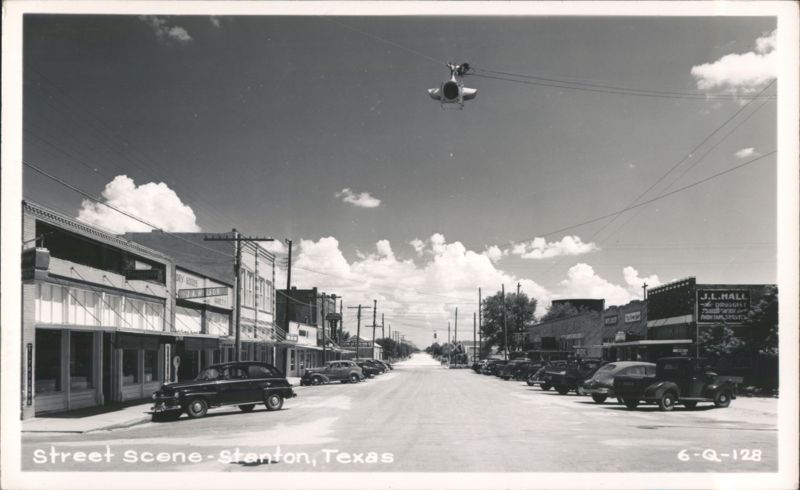 View of a main street lined with businesses including Firestone and J.L. Hall Druggist, parked vintage cars, and a prominent overhead traffic light.