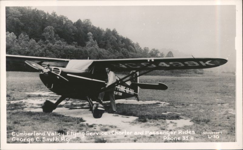 A man stands next to a single-engine airplane, NC3499K, belonging to Cumberland Valley Flying Service, which offered charter and passenger rides. George C. Smith was the manager.