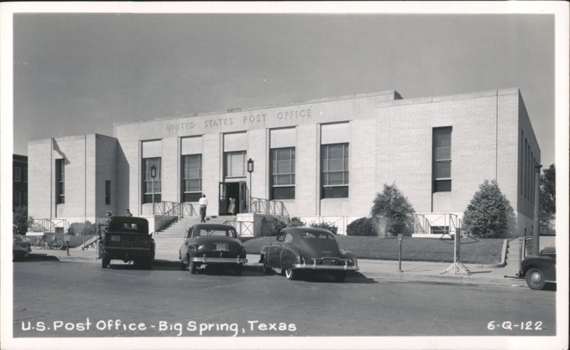 A black and white view showing the United States Post Office building. Several classic cars are parked on the street in front, and a few people are seen on the steps leading to the main entrance.