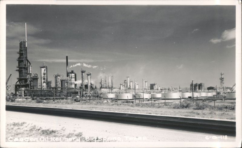 View of the industrial complex, featuring tall distillation towers, pipes, and large storage tanks under a cloudy sky.