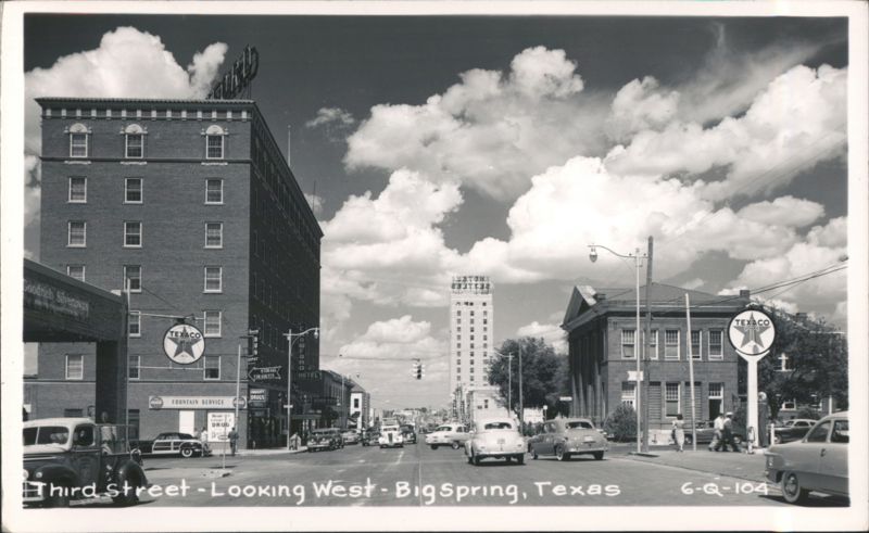 Street view with cars, pedestrians, buildings, a Texaco gas station, and the Settles Hotel in the distance.
