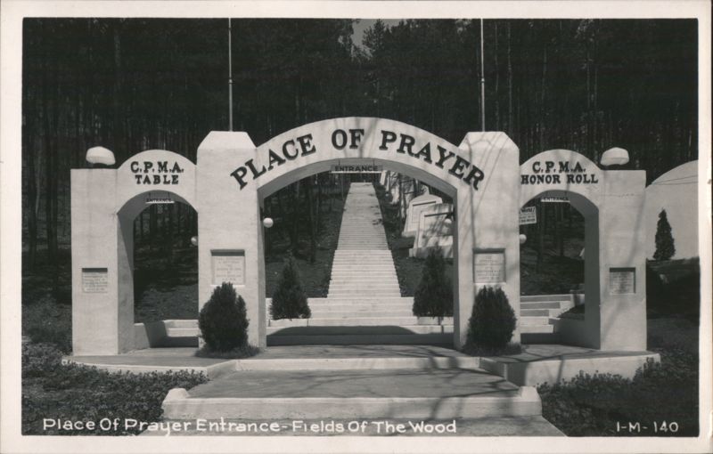 A large archway with steps leading up a hill into a wooded area. The archway is labeled "Place of Prayer" and smaller arches are labeled "C.P.M.A. TABLE" and "C.P.M.A. HONOR ROLL".