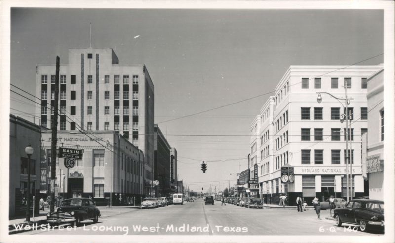 Street scene with vintage cars, First National Bank, and Midland National Bank buildings.