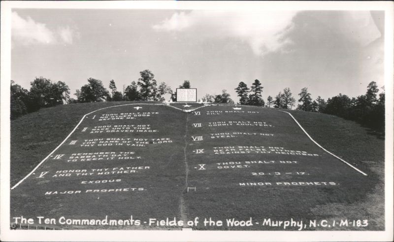 Biblical text, including the Ten Commandments, painted on a grassy hillside.
