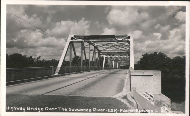View of the truss bridge with a sign indicating vertical clearance of 14 feet and horizontal clearance of 23 feet 9 inches. The concrete pillar is marked with '46' and '1934'.