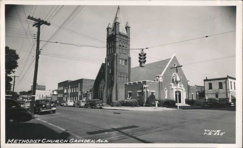 Street view of a large brick church with a tall steeple, power lines, vintage cars parked along the street, and a person walking on the sidewalk. A traffic light is visible.