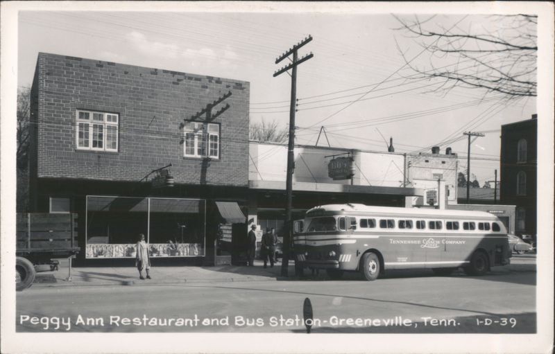 Street scene with a brick building housing the Peggy Ann Restaurant and Bus Station. A Tennessee Coach Company bus is parked outside. People and a truck are visible.