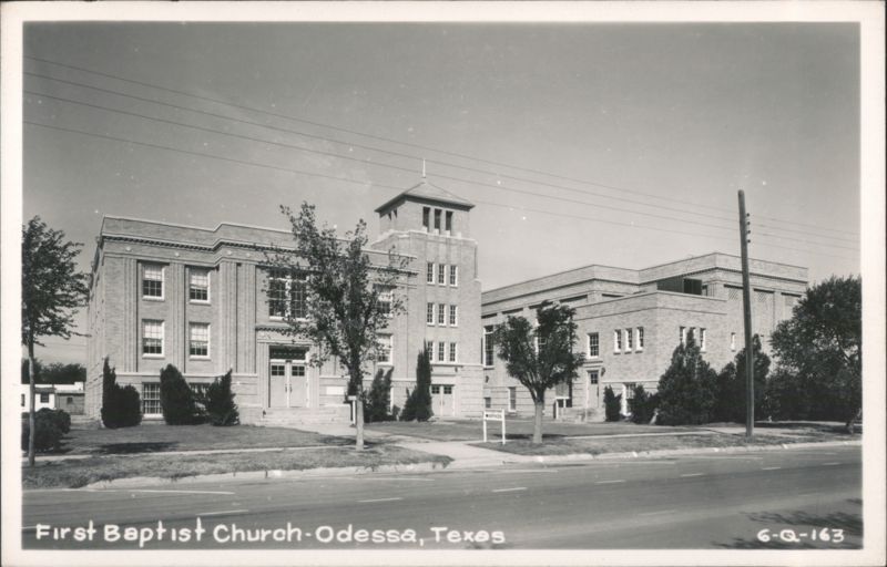A large brick church building with a prominent central tower, surrounded by trees and a lawn. A street is in the foreground, and power lines cross the sky. A sign reading "OFFICES" is visible near the entrance.