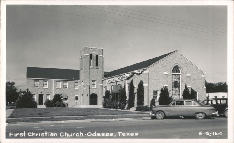 A church building with a banner reading 'REVIVAL' and two cars parked on the street.