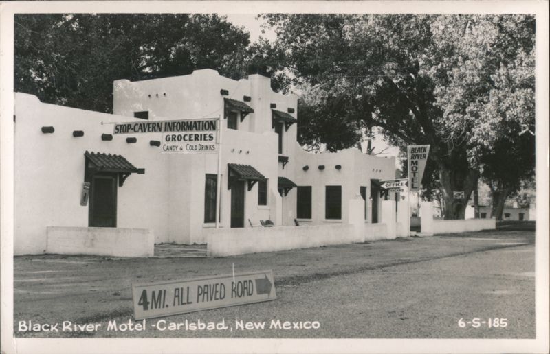 Adobe-style buildings with tiled awnings and large trees. A road sign indicates '4 Mi. All Paved Road'.