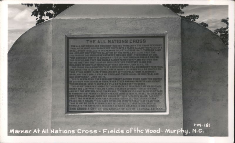 Stone monument with an inscribed plaque explaining the significance of the All Nations Cross.