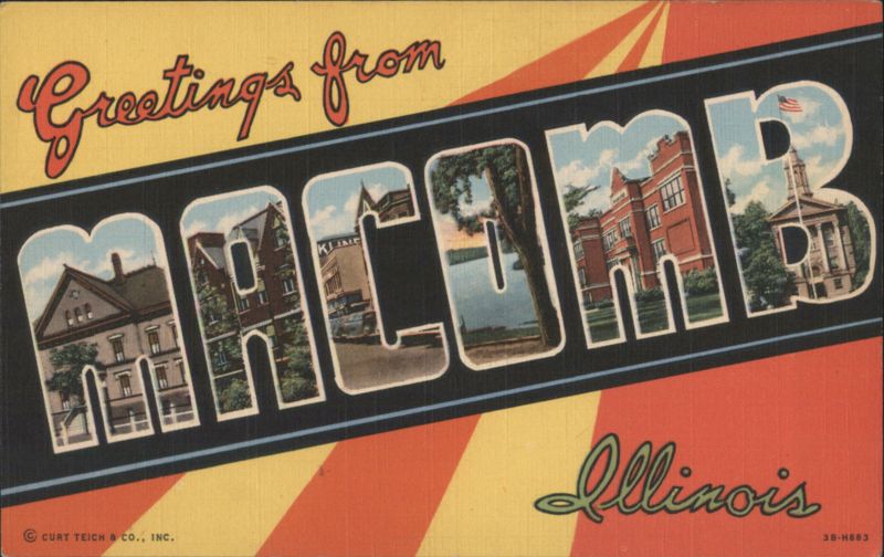 Various scenes of Macomb, Illinois, depicted within the letters spelling 'MACOMB'.
