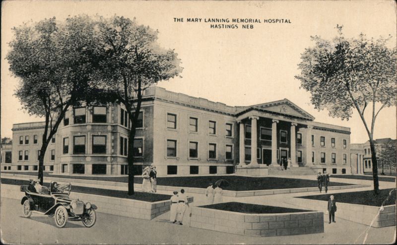 Exterior view of the Mary Lanning Memorial Hospital, described as fireproof, modern, well-equipped, non-profit, and non-sectarian. Features people on the grounds and an early automobile.
