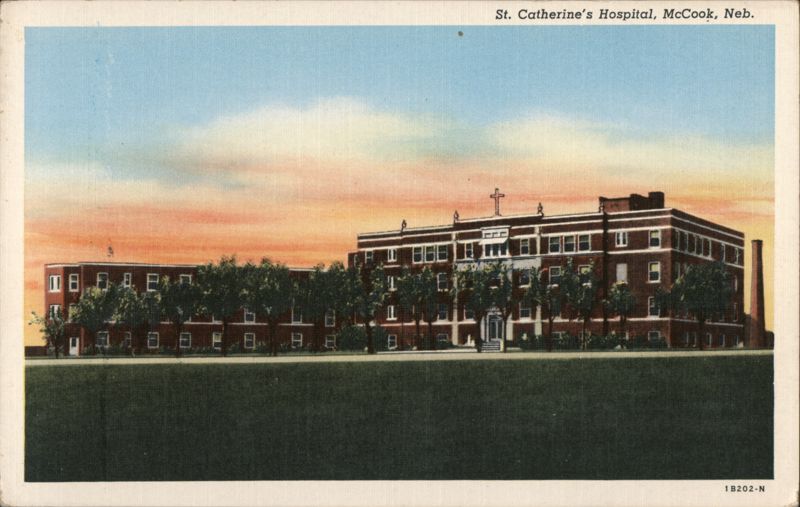 A large brick hospital building with a prominent cross on its roof, set amidst a green lawn and trees, under a sky with a colorful sunset gradient.