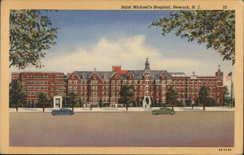 View of the large brick hospital building with a central spire, surrounded by trees. Two cars are visible on the street in the foreground. The institution was conducted by the Sisters of the Poor of St. Francis Provincialate.