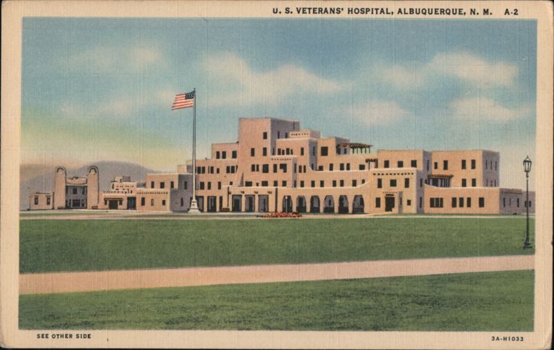 | Occupying 515 acres of land 5 miles east of Albuquerque, New Mexico, this new hospital for Ex-soldiers of all wars was built at a cost of $1,250,000.00. It has a capacity of caring for 262 patients with provisions for an increase of twice that number. There are approximately 250 employees including executives, physicians, nurses. |