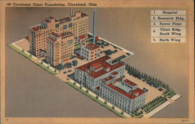 Aerial view of the Cleveland Clinic Foundation campus, identifying the Hospital, Research Building, Power Plant, Clinic Building South Wing, and North Wing.