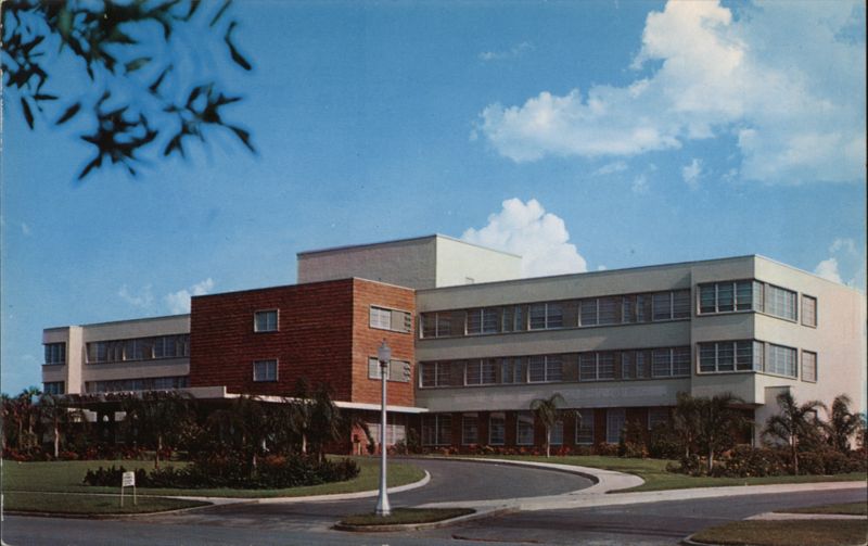 Modern hospital building with a circular drive and landscaped grounds under a blue sky. Opened February 1, 1956.