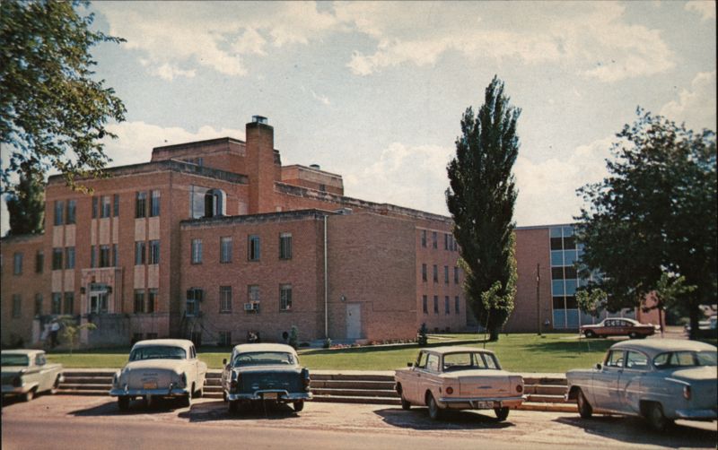 This view shows the modern 100 bed municipal owned hospital in this progressive city. It is excellently staffed and equipped to serve the entire surrounding area as it does. Clovis is known as the Feed Manufacturing Center of the Southwest — More flour is milled in Clovis than in any other New Mexico city. It is an important railroad and highway junction for the area — progressive — modern and friendly city to live in — Come and see. |