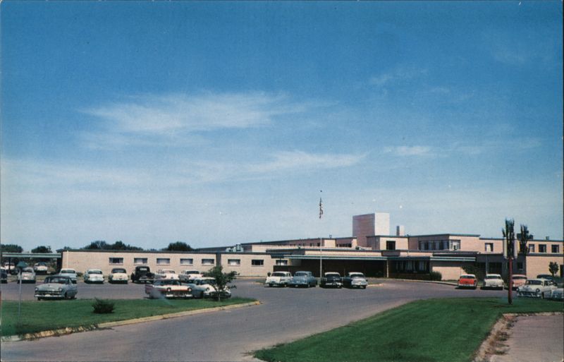 A new, modern general hospital with complete facilities, featuring a large building and parking lot filled with cars under a clear sky.