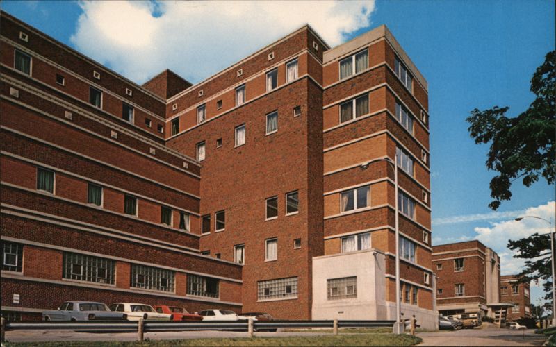 A multi-story brick hospital building with numerous windows and multiple wings, featuring cars parked along the street in front.