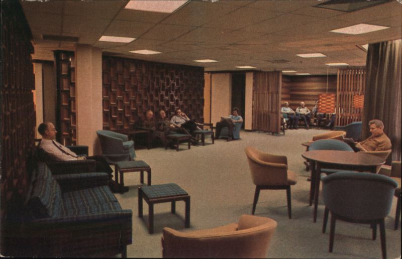 A spacious lounge area with multiple seating arrangements, including upholstered chairs and sofas. Several men are seated, some reading, some conversing. The room features wood paneling and patterned walls.