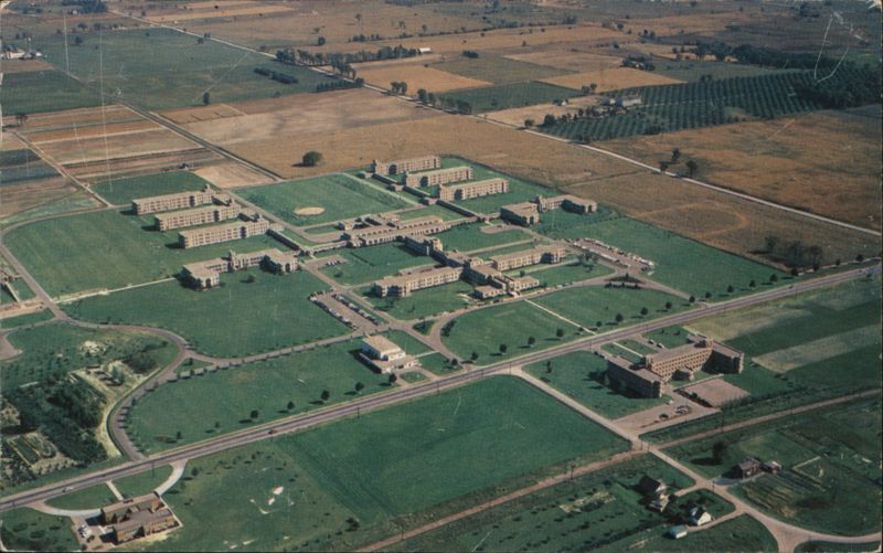 Large institutional complex with multiple buildings surrounded by extensive green lawns and farmlands.