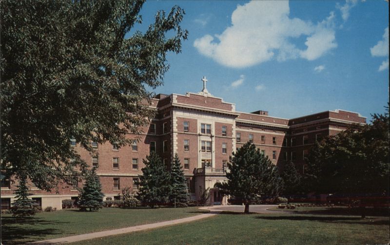 View of the large brick hospital building with a cross on its central tower, surrounded by green lawns and mature trees under a cloudy sky.