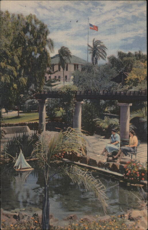 View of the Main Building from Inspiration Point, featuring a garden with a pond, a miniature sailboat, and two women seated by the water.