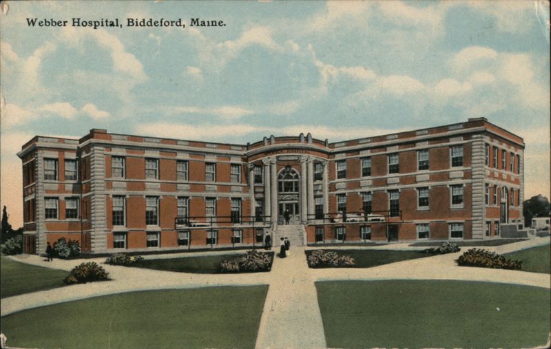 Exterior view of the large brick hospital building with a central entrance and surrounding lawn.