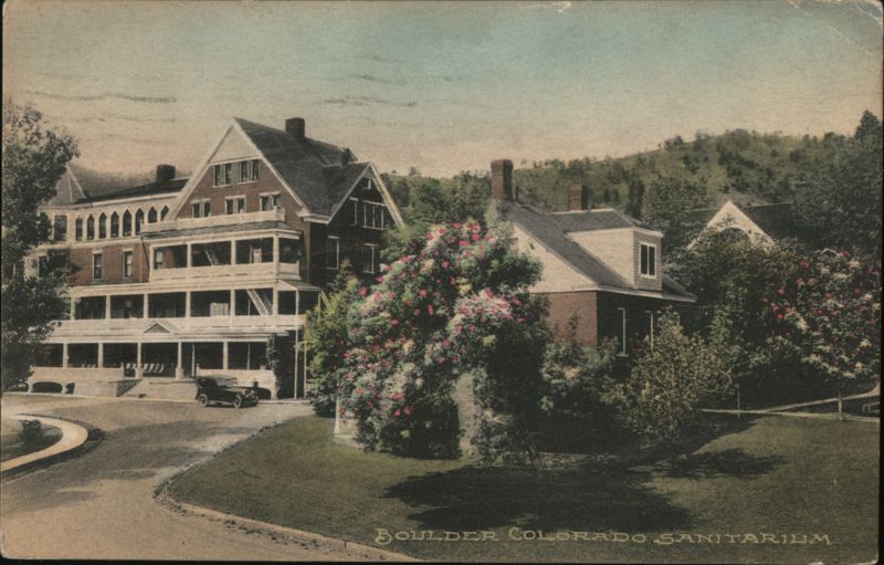 A large multi-story building with wrap-around porches and a smaller adjacent building, surrounded by trees and a winding road.