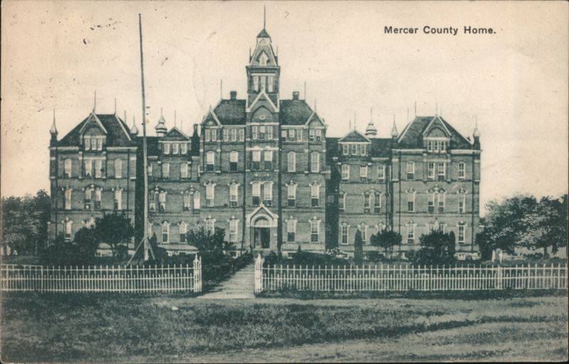 Large institutional building with a central tower and wings, surrounded by a white picket fence.