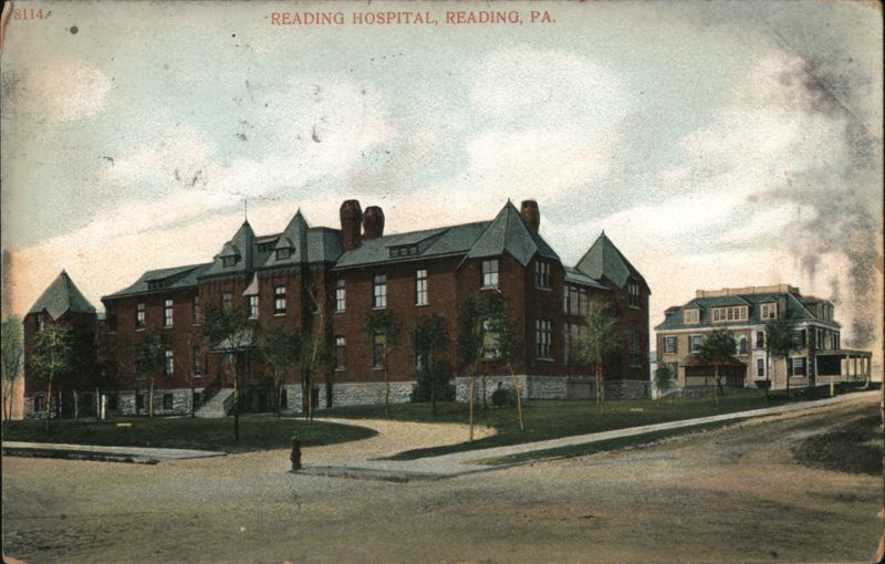 A large brick hospital building with multiple wings and distinctive roofs, surrounded by green lawns and trees. A smaller building is visible to the right, with roads in the foreground.
