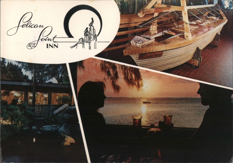 Collage view of Pelican Point Inn, featuring its logo with pelicans, a unique boat-shaped buffet in the restaurant, an exterior view of the building, and a scenic sunset over the water with silhouetted figures.