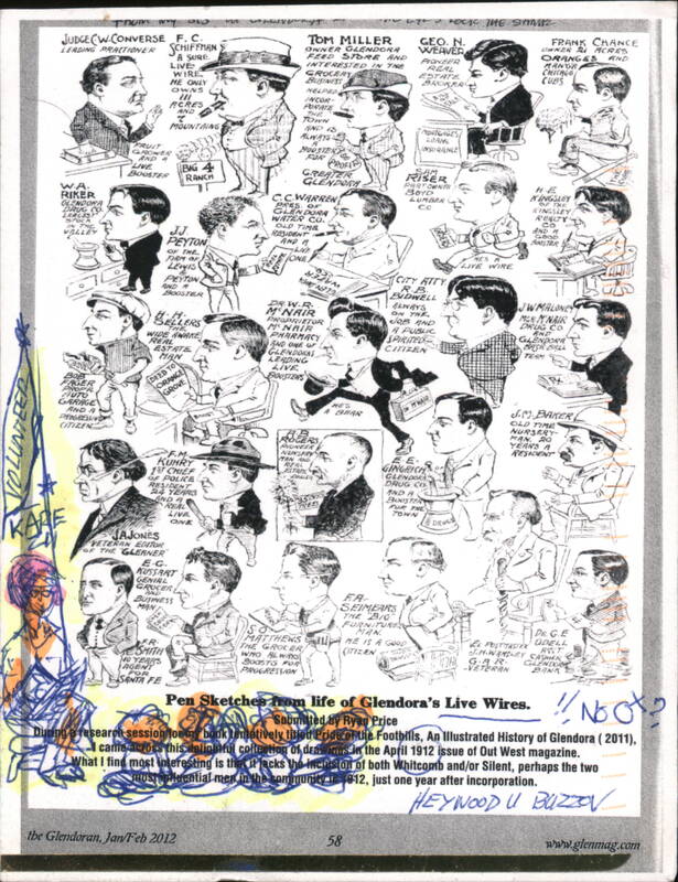 A collection of caricatures of prominent men from Glendora, originally published in the April 1912 issue of Out West magazine. The sketches are attributed to artist Ryan Price.