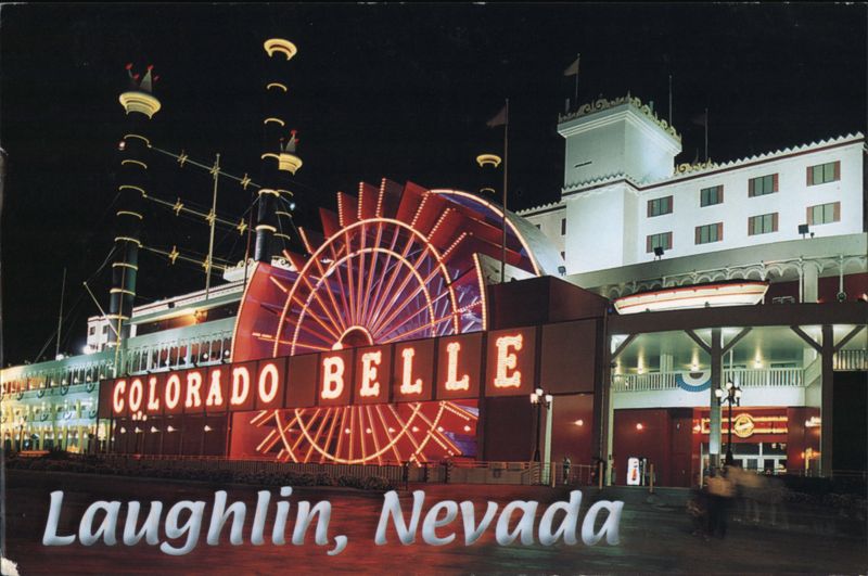 Illuminated view of the Colorado Belle Hotel Casino with its prominent paddlewheel facade and neon sign.