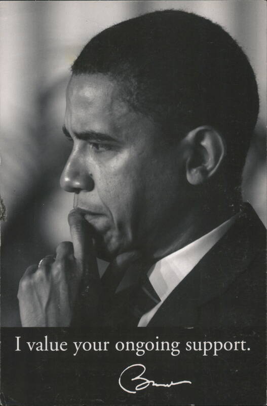 Black and white portrait of Barack Obama, appearing thoughtful with his hand on his chin. The card includes a message of appreciation for ongoing support and political commentary on the reverse.