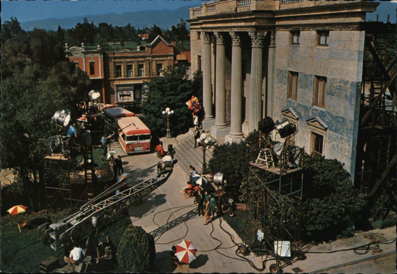 An aerial view of an outdoor film set on the Universal Studios back lot, featuring large classical-style buildings, a red bus, numerous crew members, and extensive lighting and camera equipment on scaffolds and cranes, indicating an active production. |