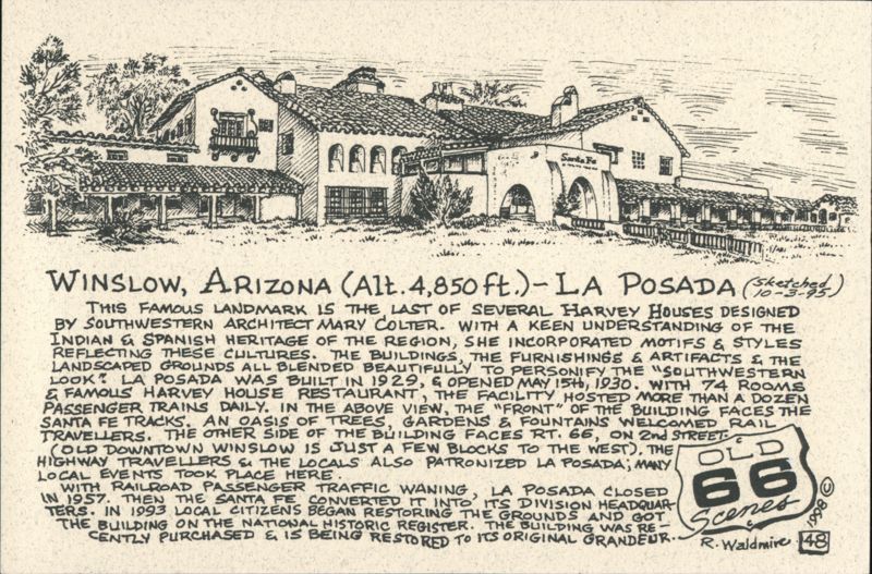 This landmark hotel, La Posada, was the last of several Harvey Houses, designed by Southwestern architect Mary Colter. It incorporated motifs and styles reflecting Indian and Spanish heritage. Built in 1929 and opened in 1930 with 74 rooms, it hosted many Santa Fe passenger trains daily. The building faces the Santa Fe tracks, with gardens and fountains. After closing in 1957 and being converted to division headquarters, local citizens began its restoration in 1993, returning it to its original grandeur. It is listed on the National Historic Register. The card also features a map of Route 66. |