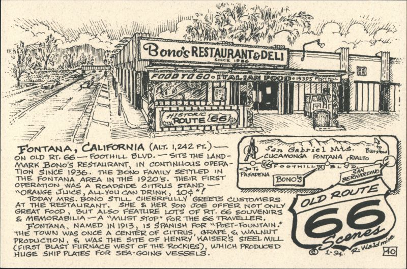Bono's Restaurant & Deli, in continuous operation since 1936, is a landmark on Foothill Blvd., Old Route 66. The Bono family initially ran a roadside citrus stand. Fontana, established in 1913, was a hub for citrus, grape, and walnut production, and home to Henry Kaiser's Steel Mill. Route 66, certified in 1926 and fully paved by 1936, was decertified in 1985, yet over 80% remains driveable. |